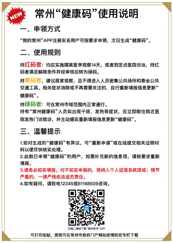 市民可通过“我的常州”APP自行申领“健康码”,如您未进行返常人员信息申报,请通过“个人健康信息填报”完善个人信息,将在次日根据您填报的信息为您生成个人“健康码”。支持绿、黄、红三色动态管理,为常州市民工作生活出行提供便利。